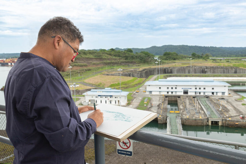Contemplando en silencio las esclusas de Agua Clara se encuentra el artista Zhen Wei, profesor decano asociado de la Universidad Normal de Beijing, en esta su primera vez en Panamá. “Veo al Canal de Panamá como un símbolo de la unidad entre los pueblos”, menciona mientras recrea en acuarela el tranquilo entorno de los edificios de las esclusas en espera de que lleguen los barcos, y añade que “conexión es la palabra clave. Conexión y estar juntos. Nunca debemos olvidar que este es un proyecto económico, pero también artístico, y aquí hoy nos estamos apreciando unos a otros”.