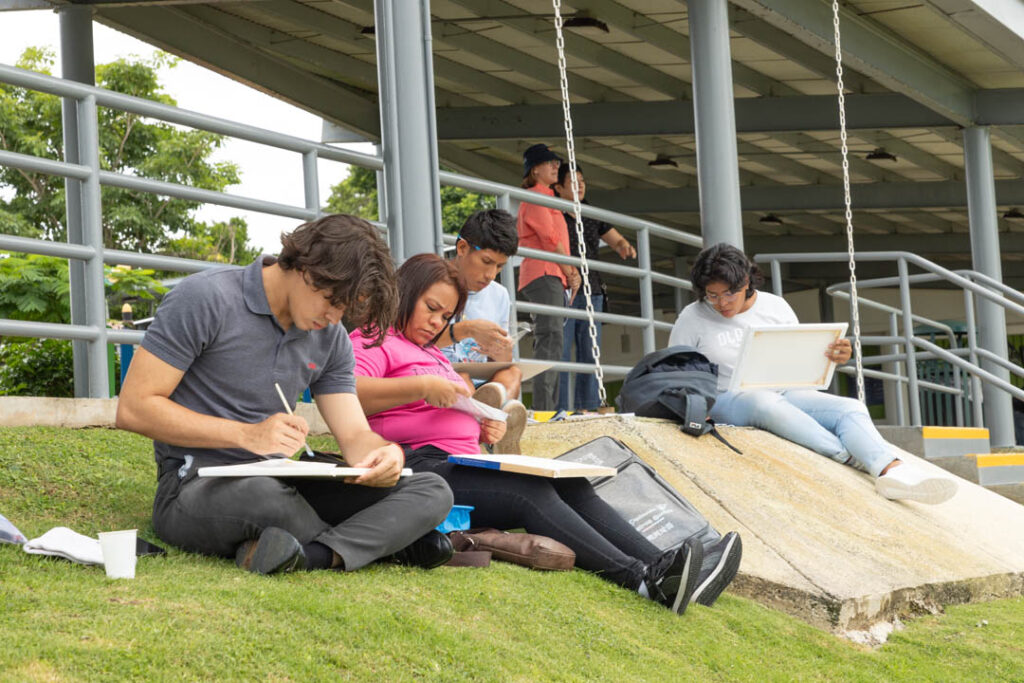 Juan Gabriel Gan, estudiante panameño de artes plásticas de la Universidad Normal de Pekín, acaba de regresar a Panamá luego de 4 años en tierras chinas y es uno de los participantes del evento. Optó por colocar su lienzo de cara al lago Gatún con la idea de reflejar el apacible contraste entre la frondosa naturaleza y los barcos neopanamax que cruzan el Canal. Juan compara las sociedades que le ha tocado vivir en los últimos años y la forma en que el arte es impartido en China al señalarnos que “hay muchísimos jóvenes chinos que desean estudiar arte y las competencias para aplicar a las universidades son muy demandantes. Esto ha causado que muchas de las expresiones artísticas de los estudiantes sean similares. En mi caso, como no pasé por ese entrenamiento, se nota la diferencia. La vibra de mi obra es diferente”. Al conversar con Juan se percibe la dicha que siente al estar en su tierra, y nos comparte que “si bien es cierto ya me acostumbré a vivir en China, Pekín es una ciudad un poco gris. Yo nací aquí, me crie aquí. Eso es lo que pasa en Panamá: te abrazan y te hacen sentir en casa de una vez”.