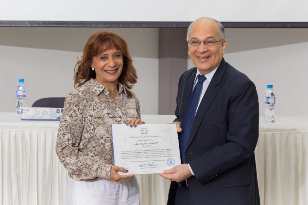 May Jane Coulson W., gerente de Gestión Administrativa y funcionaria de Ética de la Autoridad del Canal de Panamá participó de la conferencia titulada “Ética y desarrollo: compromiso de la Administración pública”. Al evento asistieron más de cien servidores públicos, de los cuales 50 habían sido designados por sus instituciones como enlaces principales y suplentes de la Red Interinstitucional de Ética Pública (RIEP).