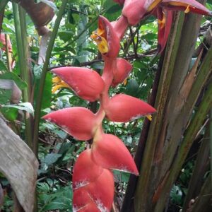 En estas brácteas se asoman las florecitas, sencillas, pero de abundante néctar que atrae insectos, murciélagos y aves, especialmente los colibríes quienes son su principal polinizador. Ellos mantienen una estrecha interacción con las heliconias, hasta el punto de que custodian celosamente cada flor y no permiten que otros colibríes se acerquen a su valiosa posesión.
