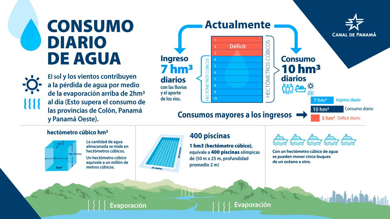 Cabe destacar que las medidas operativas, implementadas por el Canal de Panamá, permiten ahorrar diariamente 1.2 millones de metros cúbicos de agua, lo cual equivale al 80 % de lo que se consume al día en las provincias de Colón, Panamá y Panamá Oeste.