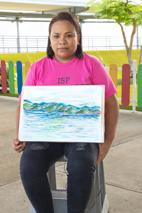 Juan Gabriel Gan, estudiante panameño de artes plásticas de la Universidad Normal de Pekín, acaba de regresar a Panamá luego de 4 años en tierras chinas y es uno de los participantes del evento. Optó por colocar su lienzo de cara al lago Gatún con la idea de reflejar el apacible contraste entre la frondosa naturaleza y los barcos neopanamax que cruzan el Canal. Juan compara las sociedades que le ha tocado vivir en los últimos años y la forma en que el arte es impartido en China al señalarnos que “hay muchísimos jóvenes chinos que desean estudiar arte y las competencias para aplicar a las universidades son muy demandantes. Esto ha causado que muchas de las expresiones artísticas de los estudiantes sean similares. En mi caso, como no pasé por ese entrenamiento, se nota la diferencia. La vibra de mi obra es diferente”. Al conversar con Juan se percibe la dicha que siente al estar en su tierra, y nos comparte que “si bien es cierto ya me acostumbré a vivir en China, Pekín es una ciudad un poco gris. Yo nací aquí, me crie aquí. Eso es lo que pasa en Panamá: te abrazan y te hacen sentir en casa de una vez”.