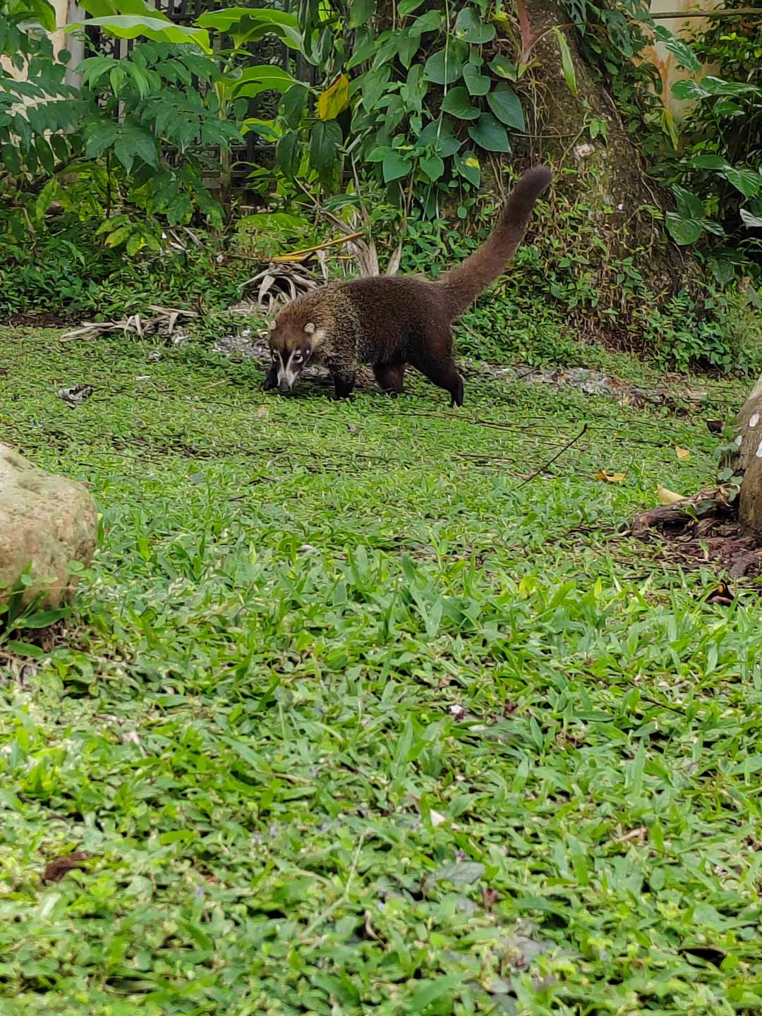 Su cuerpo mide alrededor de unos 1.30 metros, incluyendo su larga cola que mantienen erguida mientras la manada se desplaza con indiferencia por las áreas verdes. Irrumpen sin prisa, olfateando y escarbando la capa superficial del suelo en busca de bichitos. Su hocico es alargado con una nariz puntiaguda, tiene el olfato muy desarrollado y le saca provecho al buscar su alimento. Son omnívoros: su dieta incluye roedores, aves y sus huevos, crustáceos y hasta culebras. También, insectos adultos y sus larvas, lagartijas, grillos, frutos como el almendro de montaña, higos, jobos y néctar de flores del árbol de balso, por lo que tienen un rol en la polinización y dispersión de semillas en el bosque.