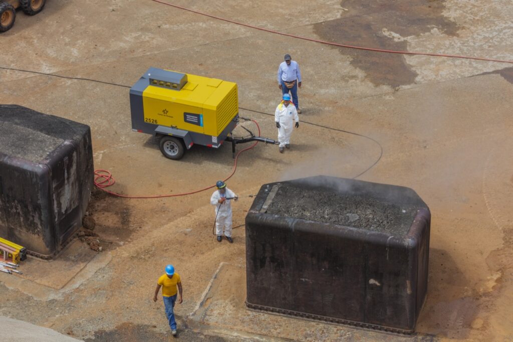 Este mes se dio el arreglo de tres bloques disipadores, los cuales presentaban partes deterioradas en su estructura de concreto. Los trabajos consistieron en demoler el concreto dañado y reparar el mismo, colocando acero de refuerzo, aplicar un puente de adherencia entre el concreto viejo y el nuevo, y restablecer las partes deterioradas con mezcla de concreto de 5,000psi devolviéndolos a su forma original.
