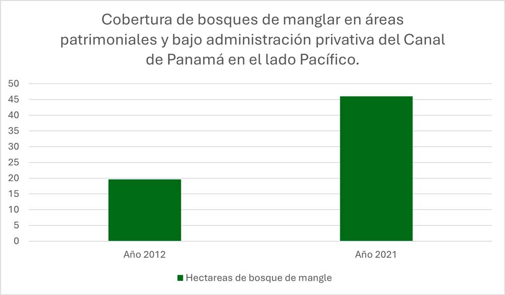 En el 2012, la cobertura de bosques de manglar en áreas patrimoniales y bajo administración privativa, comúnmente conocidas como áreas operativas del Canal de Panamá, en el lado Pacífico era de 19.57 hectáreas. Para el 2021, esta cobertura aumentó significativamente a 46.04 hectáreas, lo que representa un crecimiento aproximado del 135 %. Este notable incremento refleja los esfuerzos continuos y exitosos en la conservación y restauración de estos valiosos ecosistemas. Es crucial que sigamos protegiendo y restaurando los bosques de manglar para asegurar un futuro sostenible y saludable para nuestro planeta. ¡Cada acción cuenta!