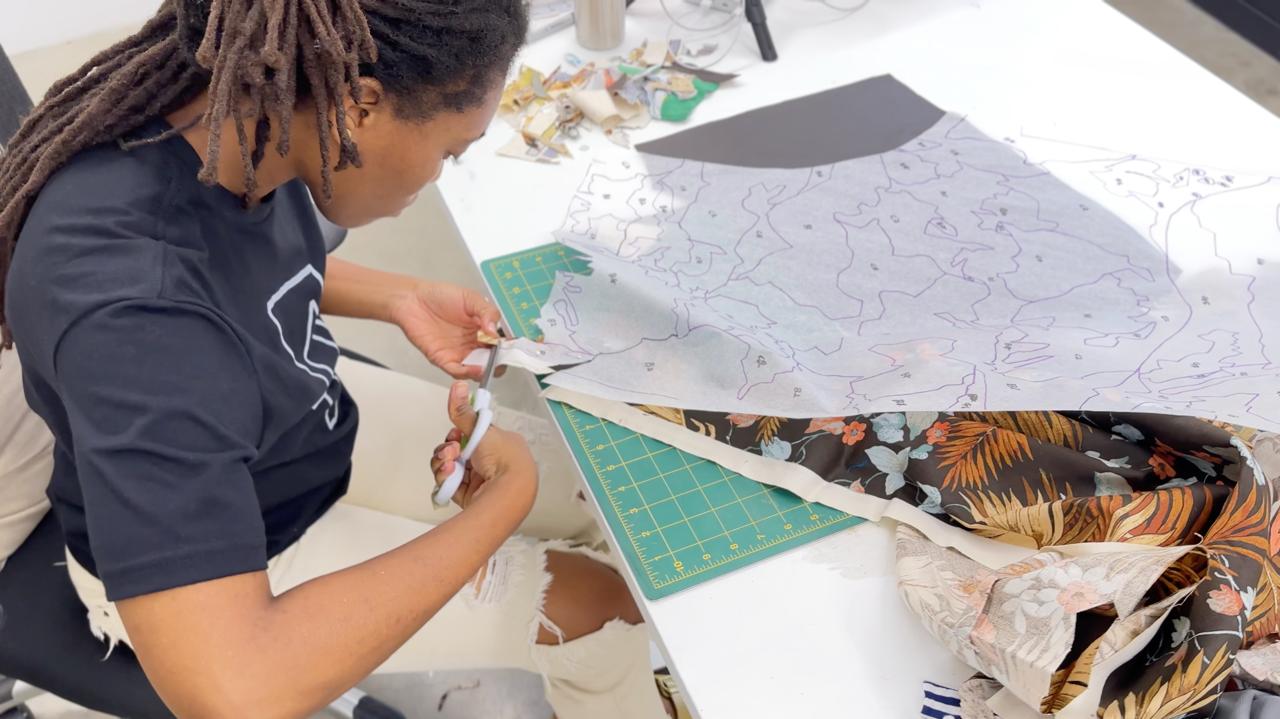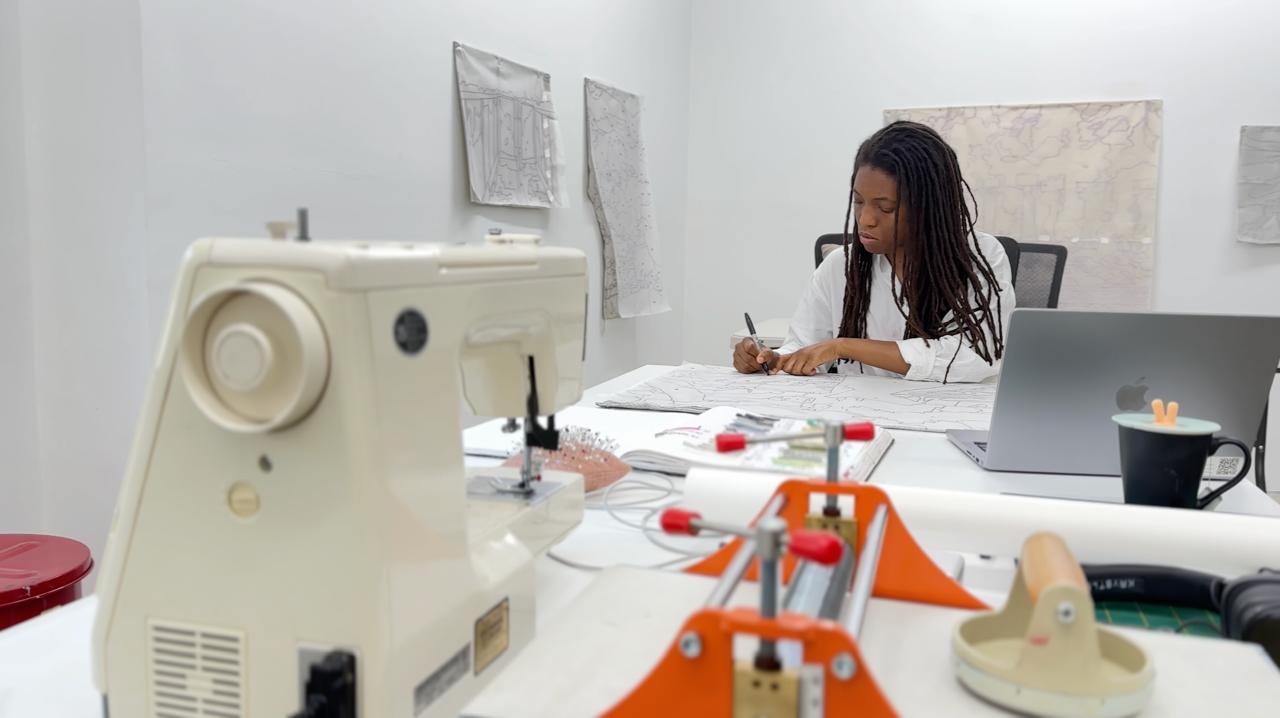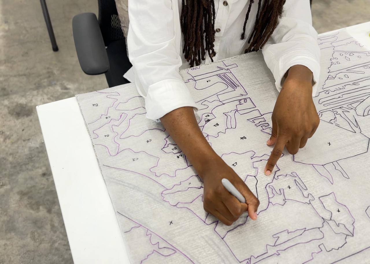 “Mi intención fue usar imágenes que fuesen familiares para la población panameña. Estudié las imágenes del Museo del Canal y el Archivo Nacional de Jamaica, y con esas imágenes crear un ensayo”, explica Lemonias de su trabajo. “Así que pienso en el uso del paisaje y las estrategias estructurales como una forma de mostrar el espacio utilizando lo mismo que en un cuadro, pero con tela. Así que pienso en cómo traducir el cielo. ¿Cómo puedo traducir el follaje? ¿Cómo puedo traducir todas estas partes del plano del espacio y luego incorporar el grabado?”, se pregunta a sí misma.