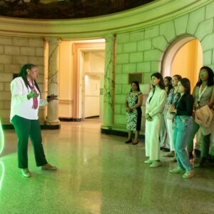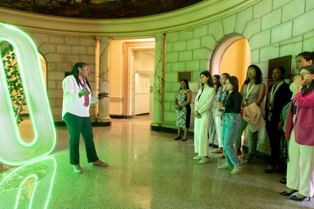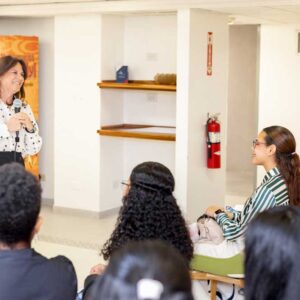 La jornada comenzó con una charla sobre la historia del edificio, sus imponentes murales y su arquitectura emblemática. Posteriormente, las estudiantes escucharon atentamente a la subadministradora, quien narró su experiencia de más de 39 años en el Canal, compartiendo lecciones tanto profesionales como personales. Marotta habló de los desafíos que enfrentó, la importancia del equilibrio entre la vida personal y laboral, y cómo la colaboración ha sido clave para su éxito.
